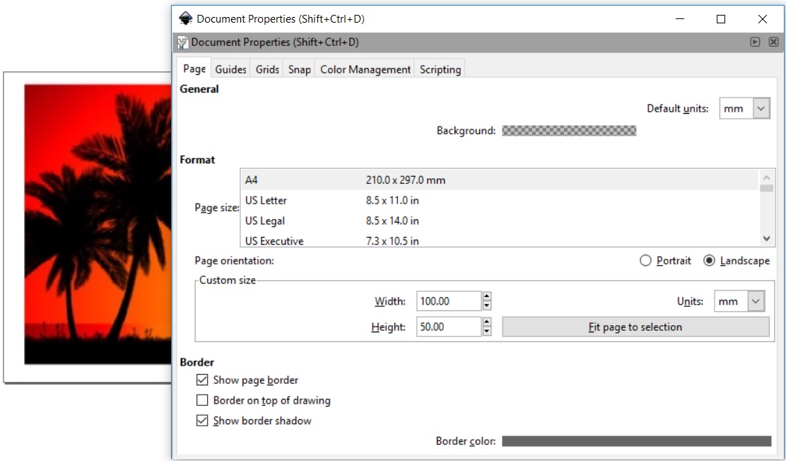 Now open inkscape and set page size to 100 mm x 50 mm from menu icon File>Document Properties.