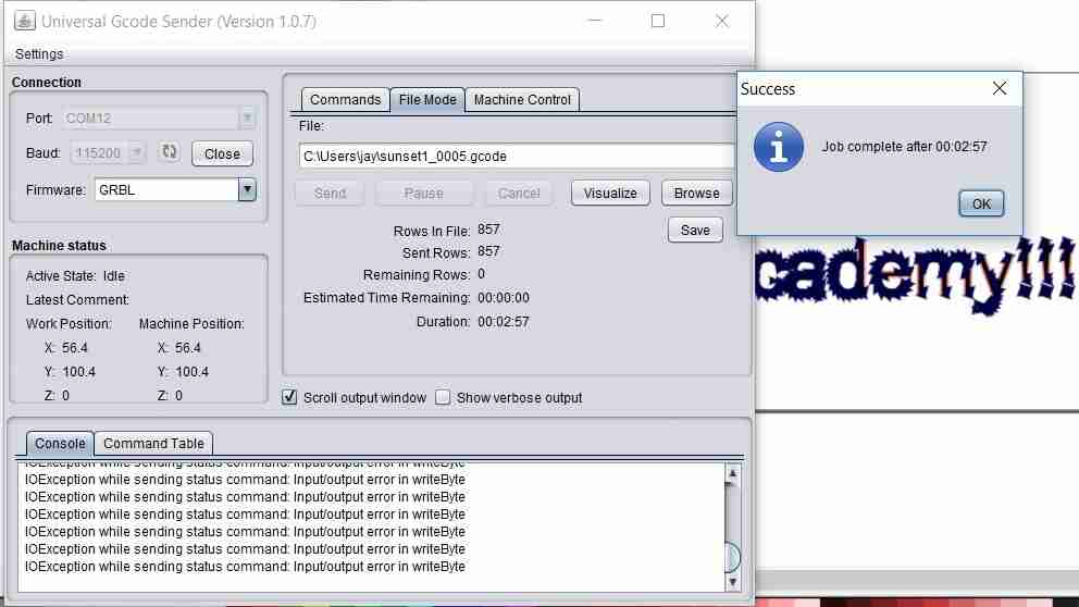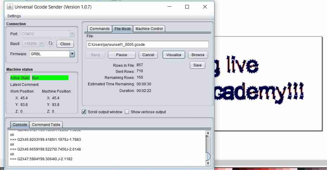 Please change the $100, $101, $130, $131 as per your document size and resolution. To change the $100 (x max travel, mm) value from 40 to 100, please enter in the command line $130=100 & hit enter. You can press $$ in the Commands tab to confirm. Now its time to stream g-code to the machine. Go to “FILE MODE” Tab. Browse to your g-code file and hit enter. The image shows the processing on the computer screen.