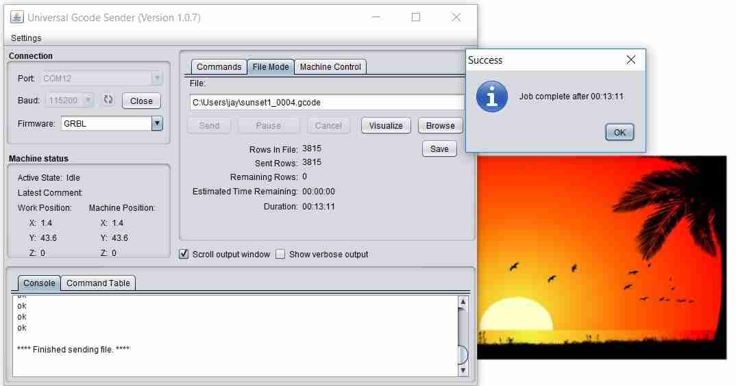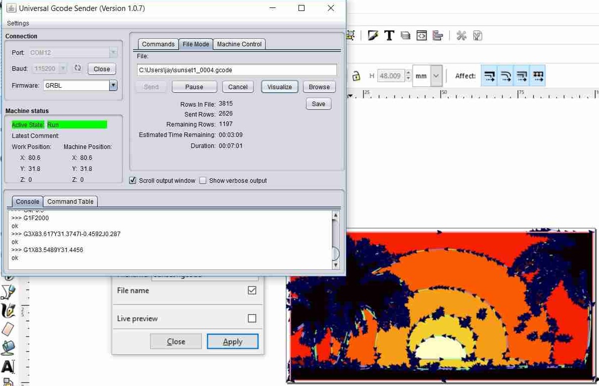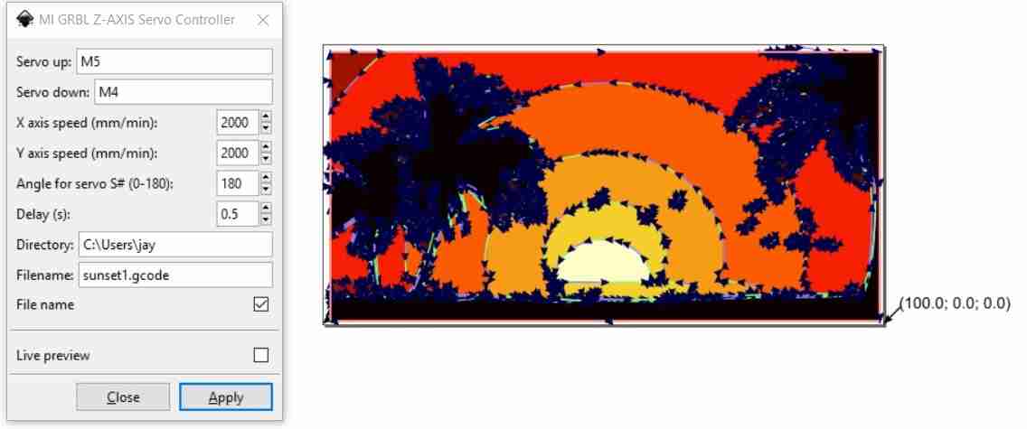 The below video is for the process explained above to create the g-code for the sunset sketch. The sunset sketch using the plotter: