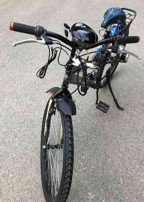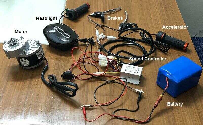 - e-bike kit with 250 W, 24 V DC motor, Throttle with wiring, brakes with wiring.