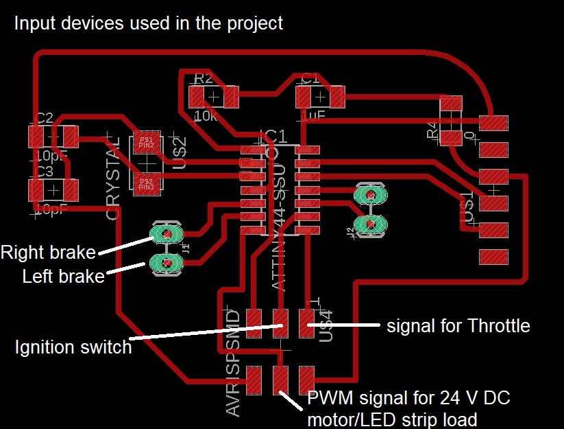 This PCB layout shows the input devices used in the project i.e. throttle, brakes and ignition switch.