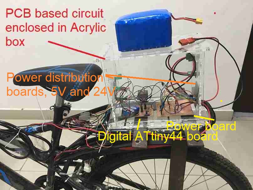 The ATtiny44 digital board has been kept towards the front of the carrier and takes the connections from the throttle, brakes and the ignition switch.