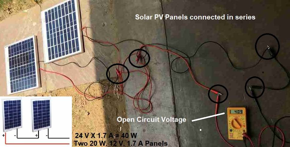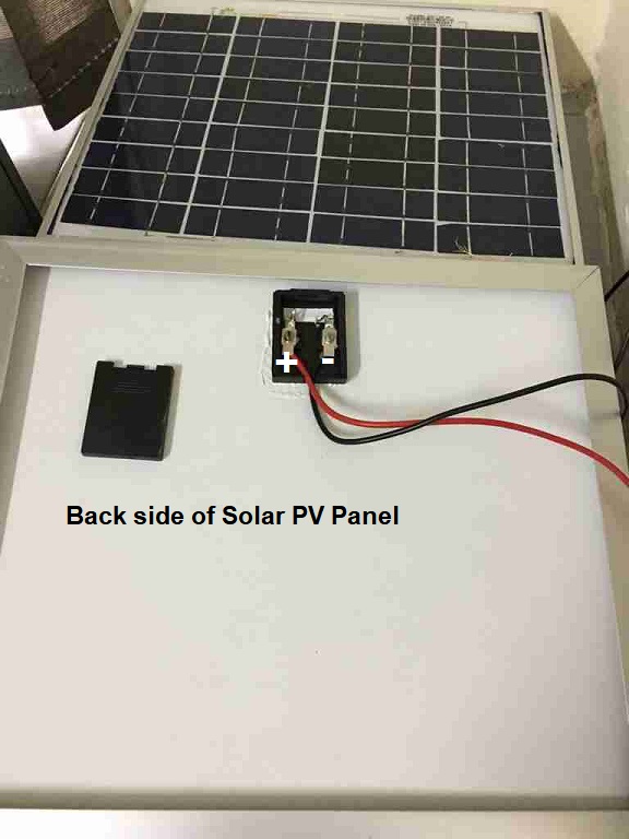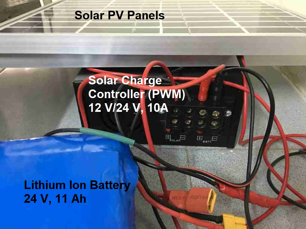 - 2 Solar PV Panels of 20 Wp each with a size of 24 cm by 32 cm, PWM solar charge controller were procured locally.