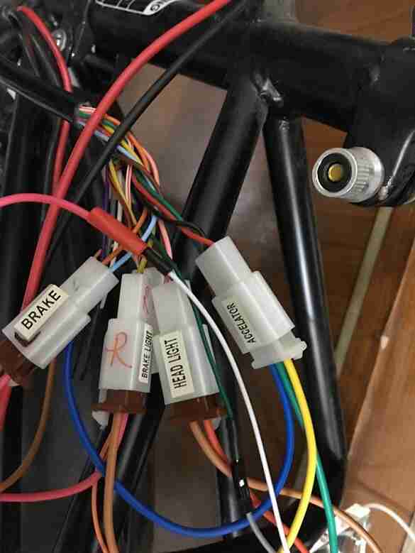 This image shows the connectors for the brakes, ignition switch, throttle, LED strip and motor at the back of the bike.