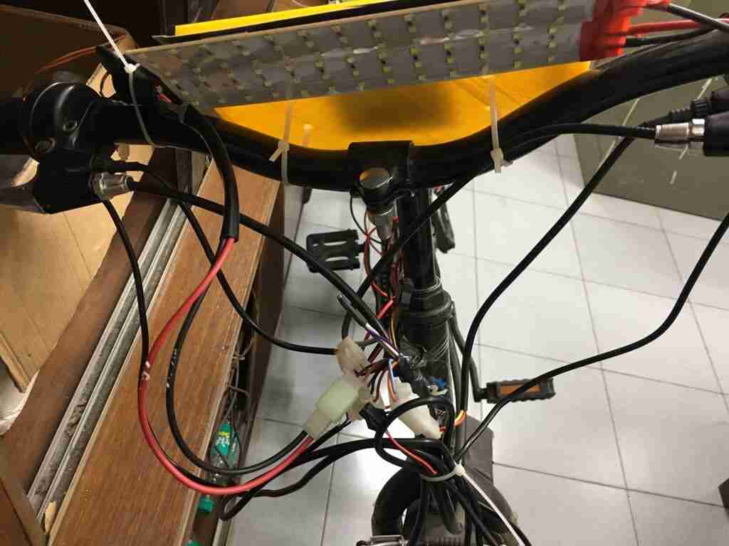 This image shows the connectors for the brakes, ignition switch, throttle and LED strip in the front of the bike.