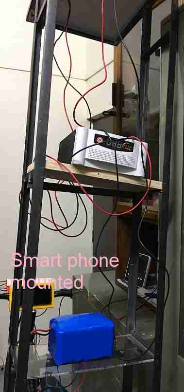 This is how the enclosed circuit looks like. The bigger box have allowed me to stick part of circuit on the side walls as well. The power board which connects the DC motor and the LED strip has been kept at the back side of the carrier and connects the Lithium Ion battery which is the power supply.