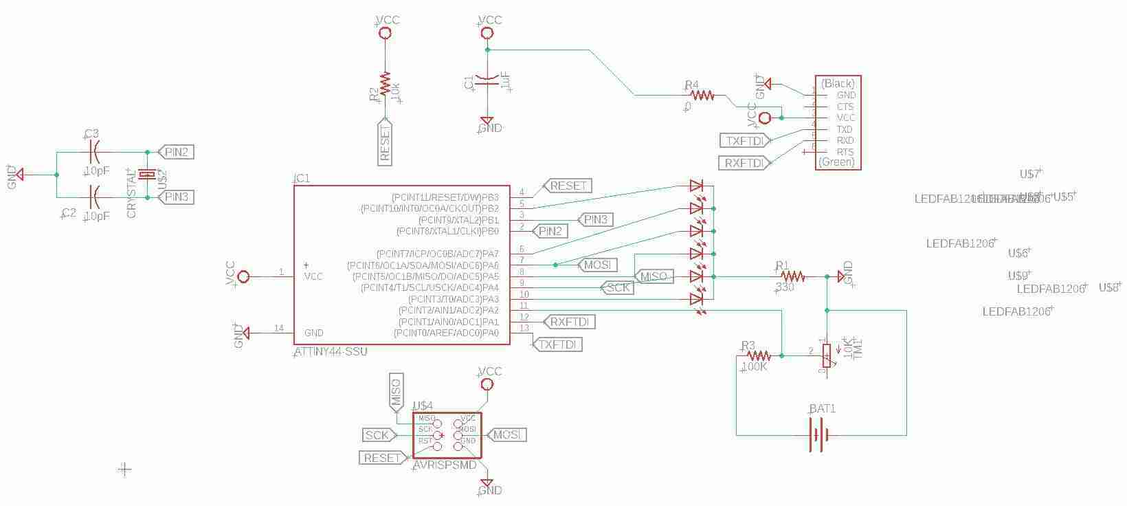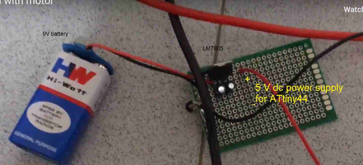 I also made a LM7805 circuit using a 9V battery to have a 5 V power supply for the ATtiny44.