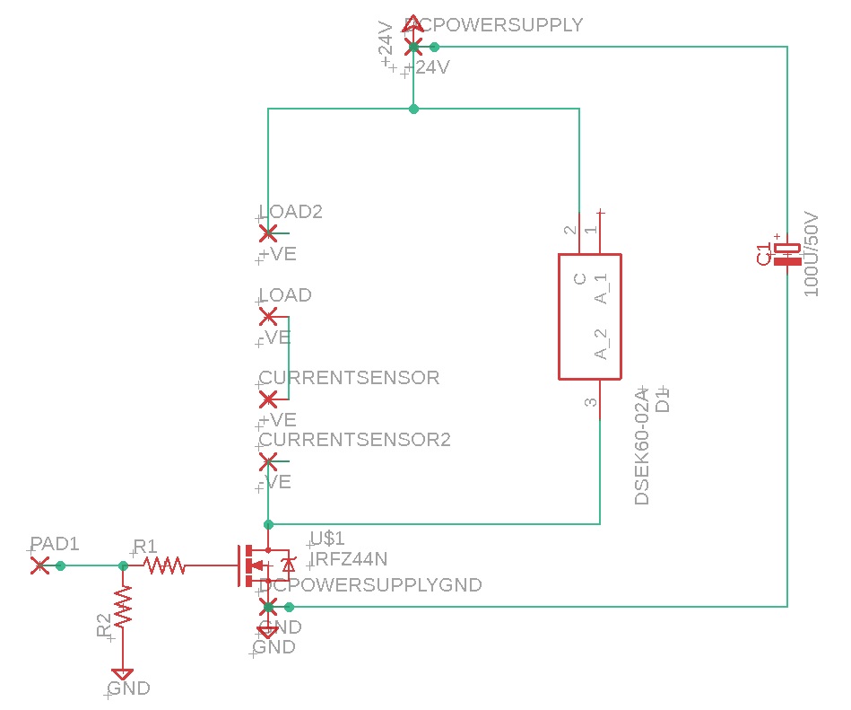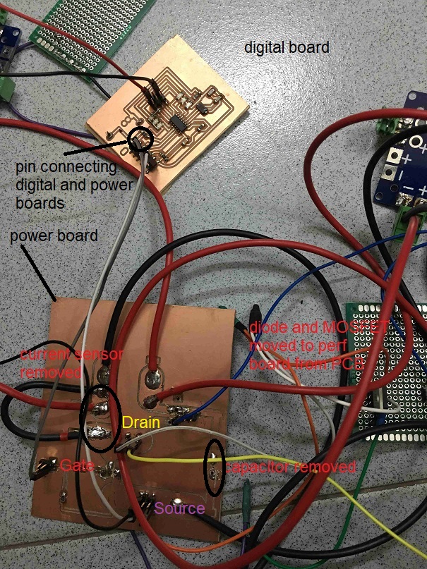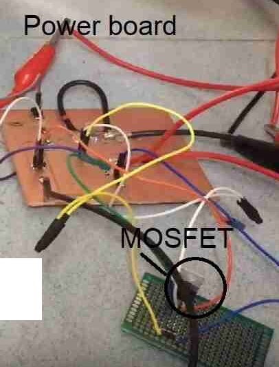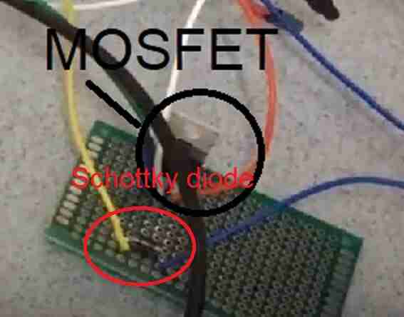 The MOSFET and the diode were connected in a perf board as per the image below as I wasn’t able to solder them properly on the PCB.