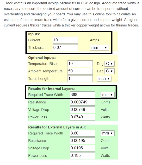 The trace width came out to be 368 mil for the internal layers. I used a trace width of 400 mil everywhere except the dc power supply as there wasn’t enough length available to place the traces. If I increased the length of traces then the board became too big to create an rml file on fabmodules.