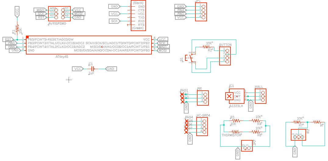 Then I added all the sensors one by one and created separate schematics for each. The ground pin of all the sensor is connected to the gnd pin of the Attiny45. Vcc of each sensor remains disconnected. I used pin-headers with the pins each sensor.