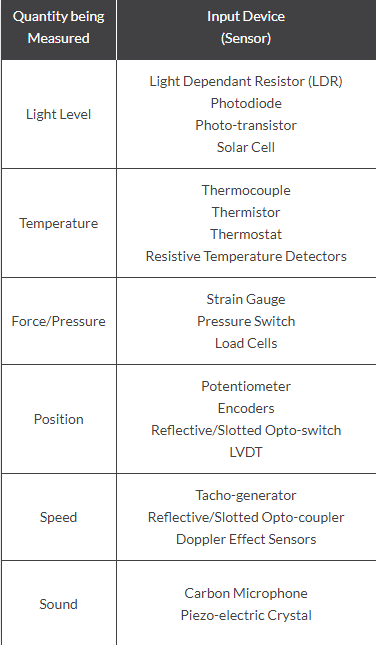 Devices which perform an “Input” function are commonly called Sensors because they “sense” a physical change in some characteristic that changes in response to some excitation, for example, heat or force and convert that into an electrical signal.