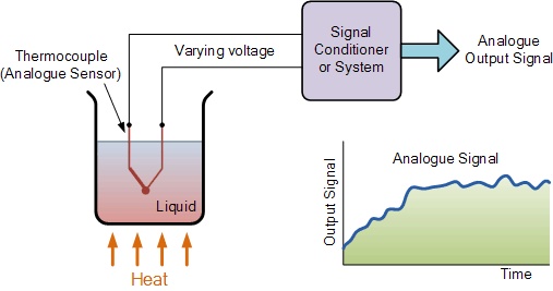 Analogue Sensors produce a continuous output signal or voltage which is generally proportional to the quantity being measured. Physical quantities such as Temperature, Speed, Pressure, Displacement, Strain, etc are all analog quantities as they tend to be continuous in nature.