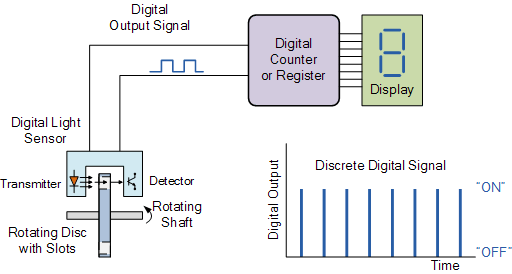 Digital Sensors produce a discrete digital output signals or voltages that are a digital representation of the quantity being measured. Digital sensors produce a Binary output signal in the form of a logic “1” or a logic “0”, (“ON” or “OFF”). This means then that a digital signal only produces discrete (non-continuous) values which may be outputted as a single “bit”, (serial transmission) or by combining the bits to produce a single “byte” output (parallel transmission).