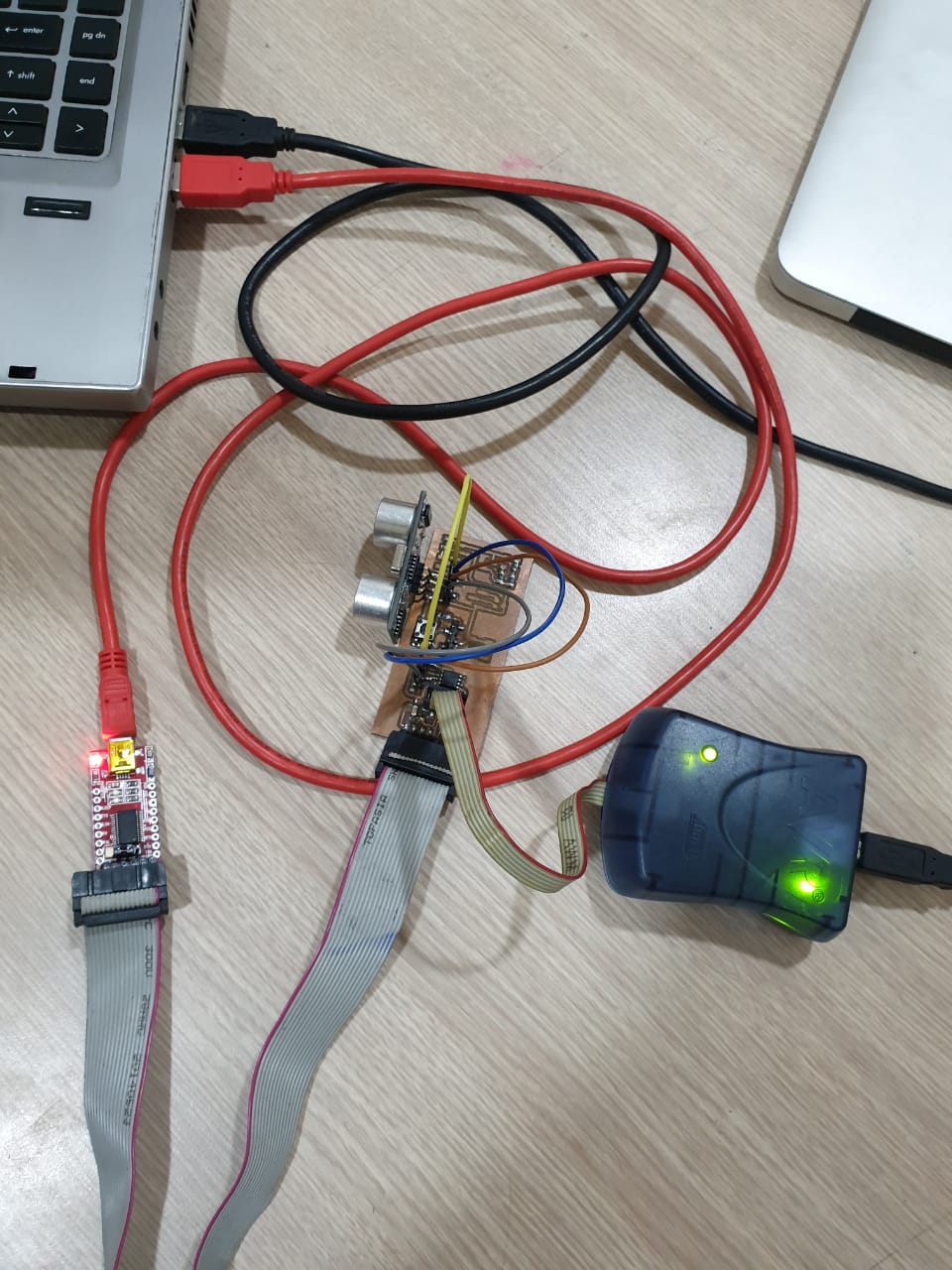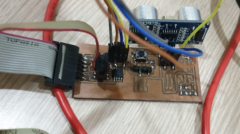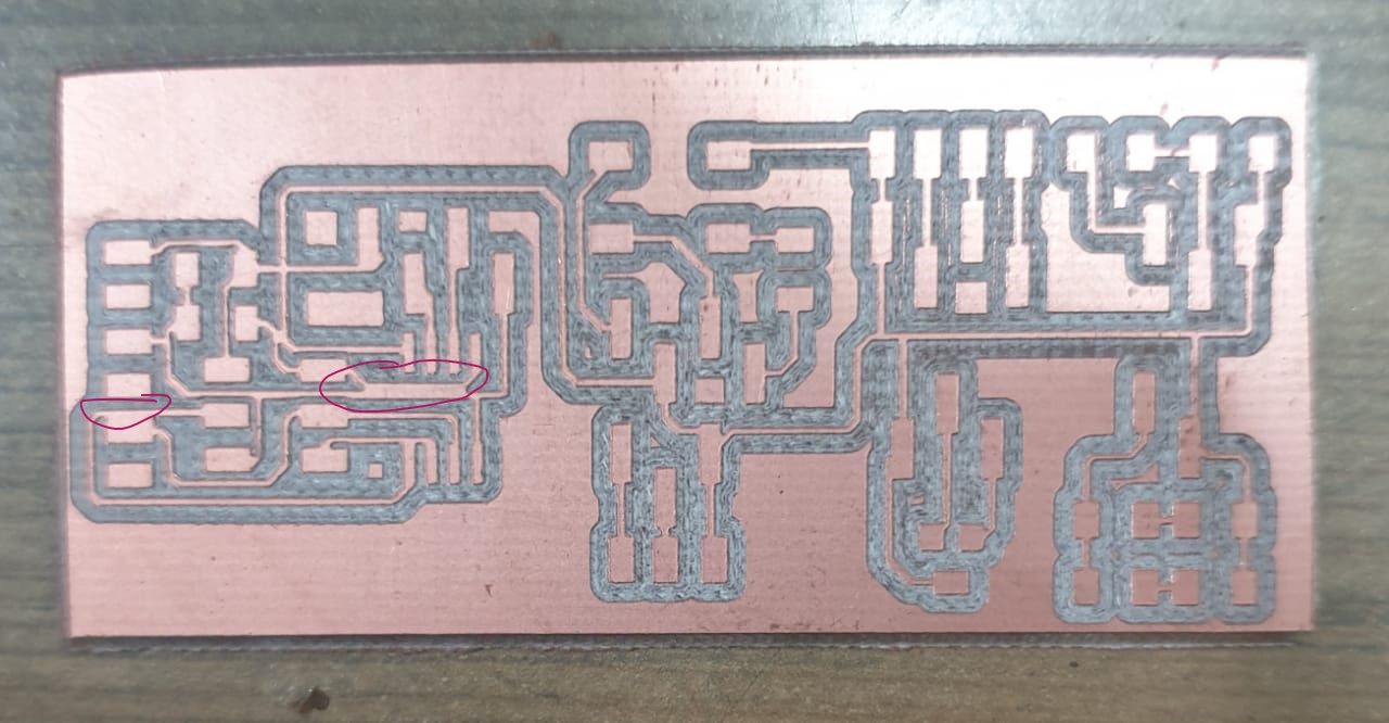 In Picture, you can see at two places the gap wasn’t enough so it didn’t mill properly and the traces were shorting. So I, using a knife, cut the copper in between the traces and made this pcb workable.
