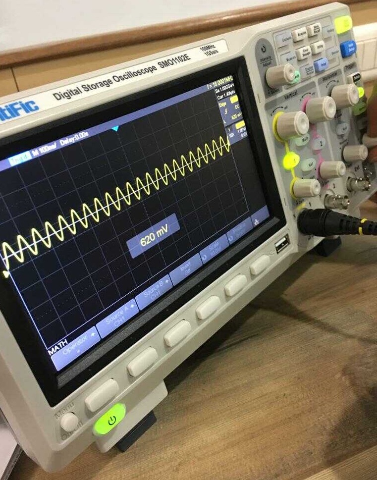 On the screen, we can clearly see an analog waveform pulsating in between negative and positive value. The peak value was +10v.
