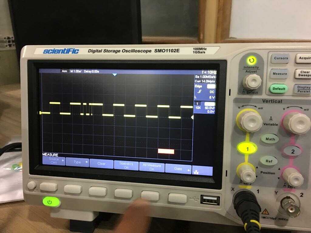 On the screen, we can see a digital pulse of frequency 1s with the peak value of 5V. As our DSO is callibrated the pulse was very smooth.