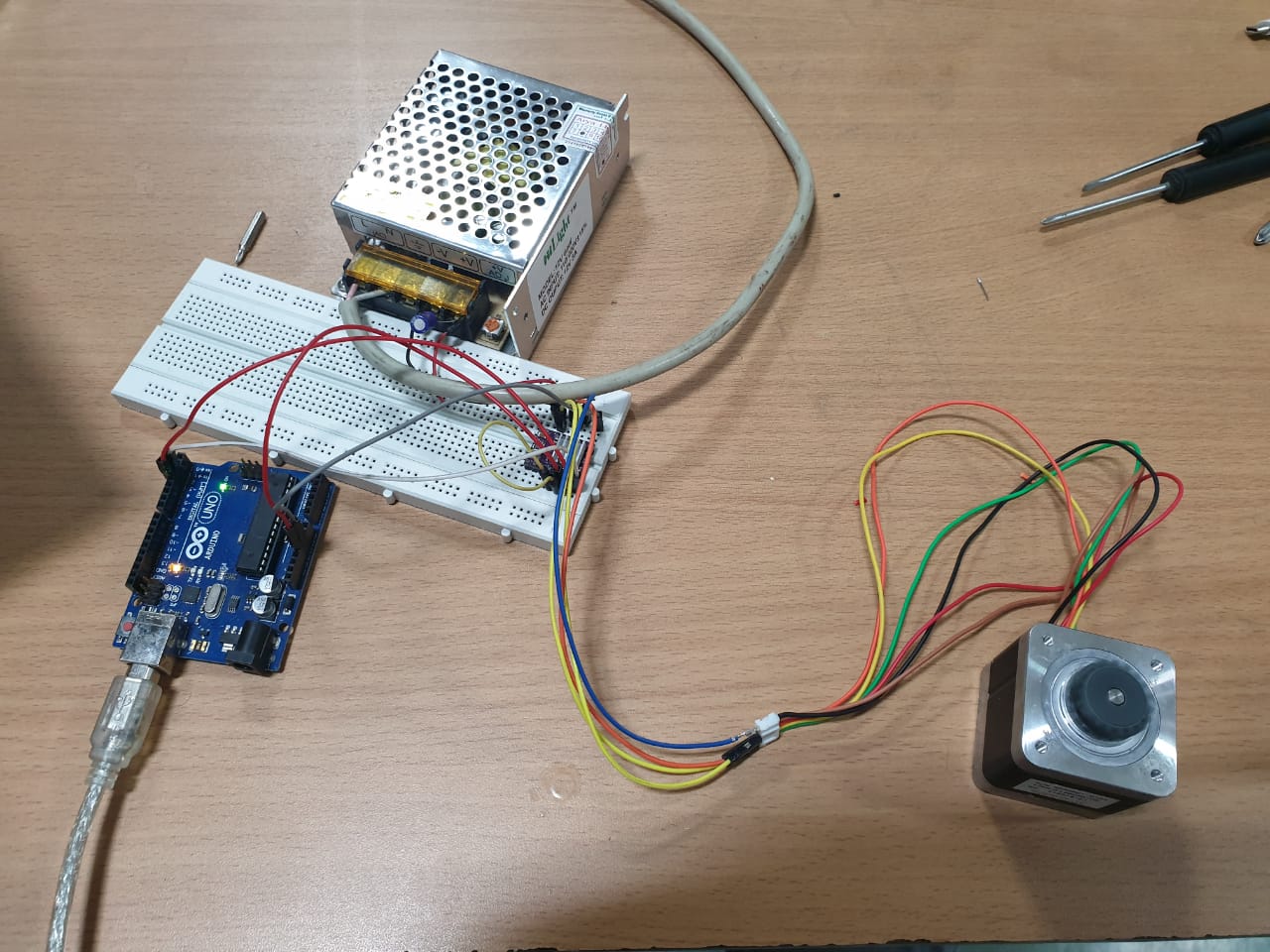 I had a stepper motor Nema17. This is a unipolar stepper motor with 6 wires. I tried to test it first and control it using Attiny 44.