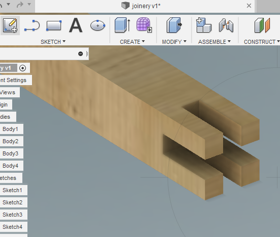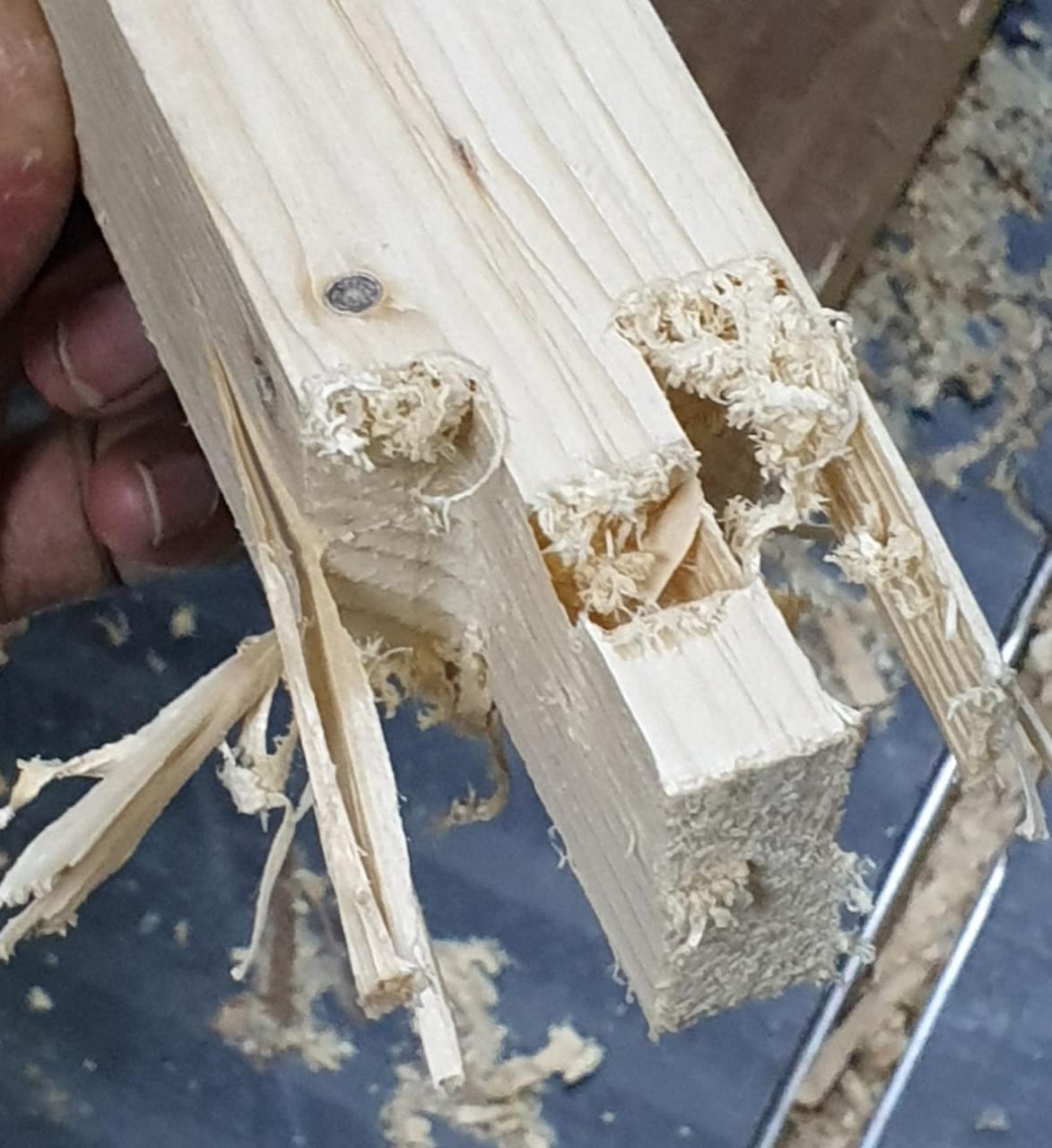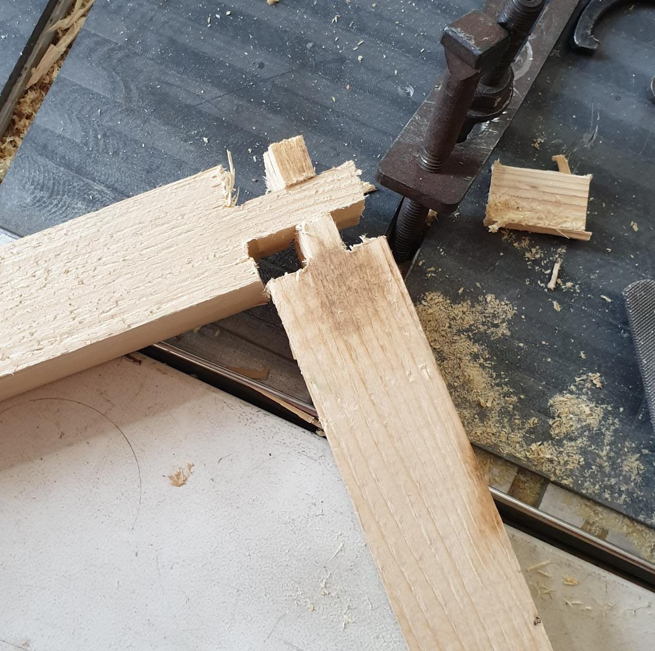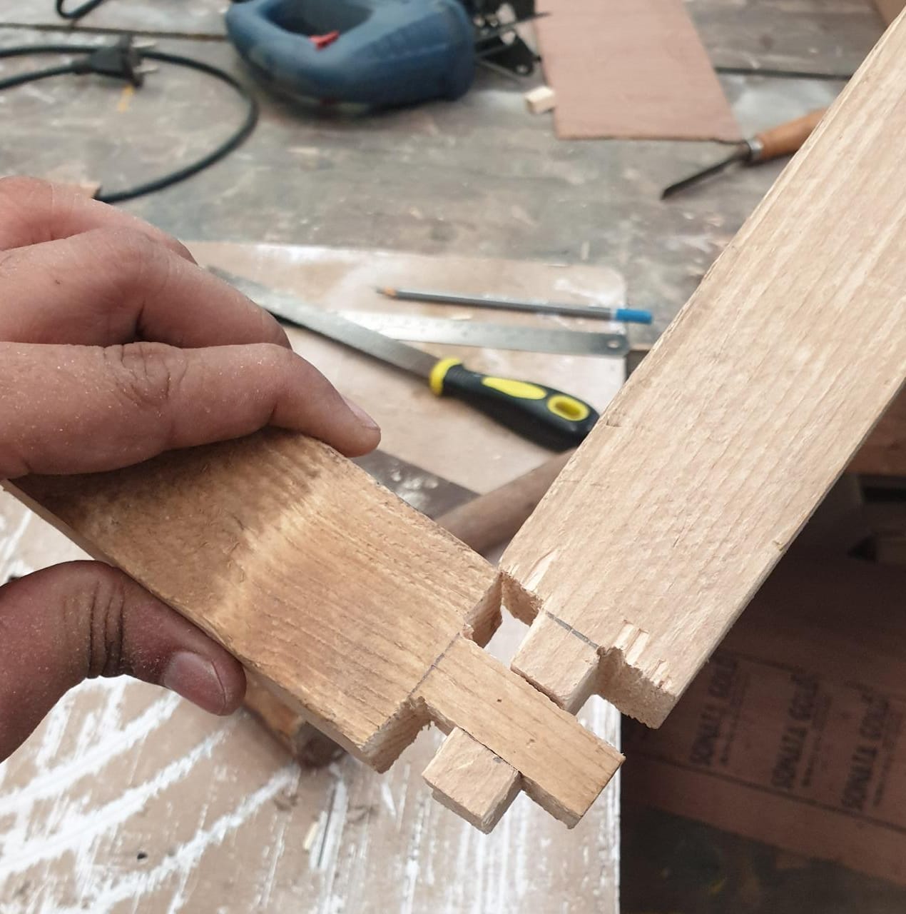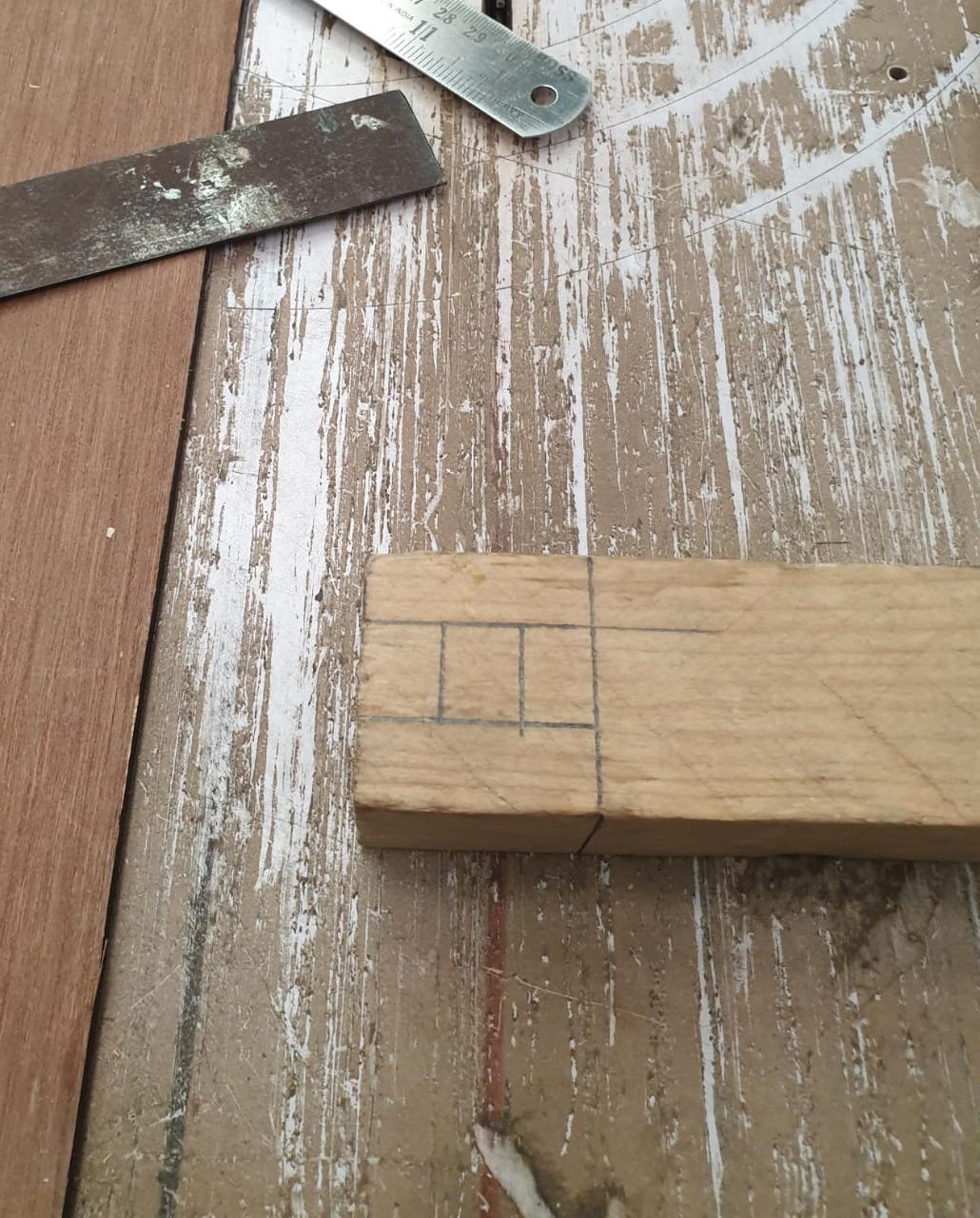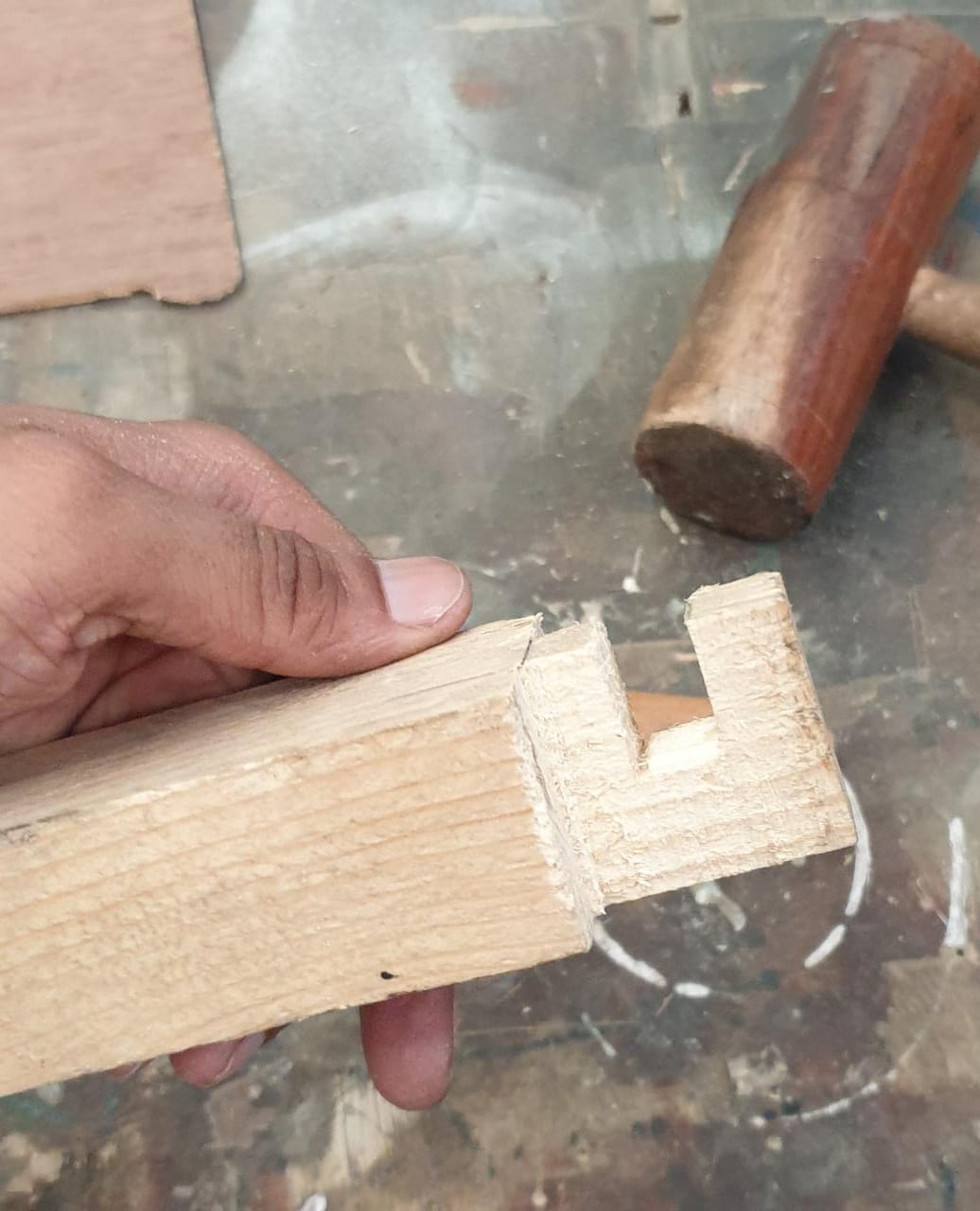 Then before cutting the joineries on the CNC machine I gave it a try by hand tools. I marked the dimensions on one side of a block and cut using handsaw and chisel. The outcome was satisfying and parts were fixing in each other easily.