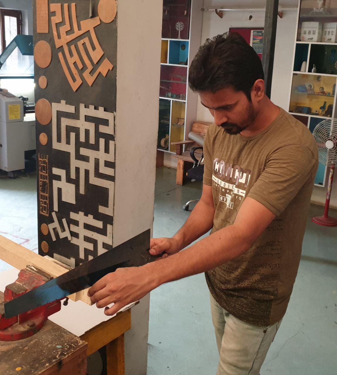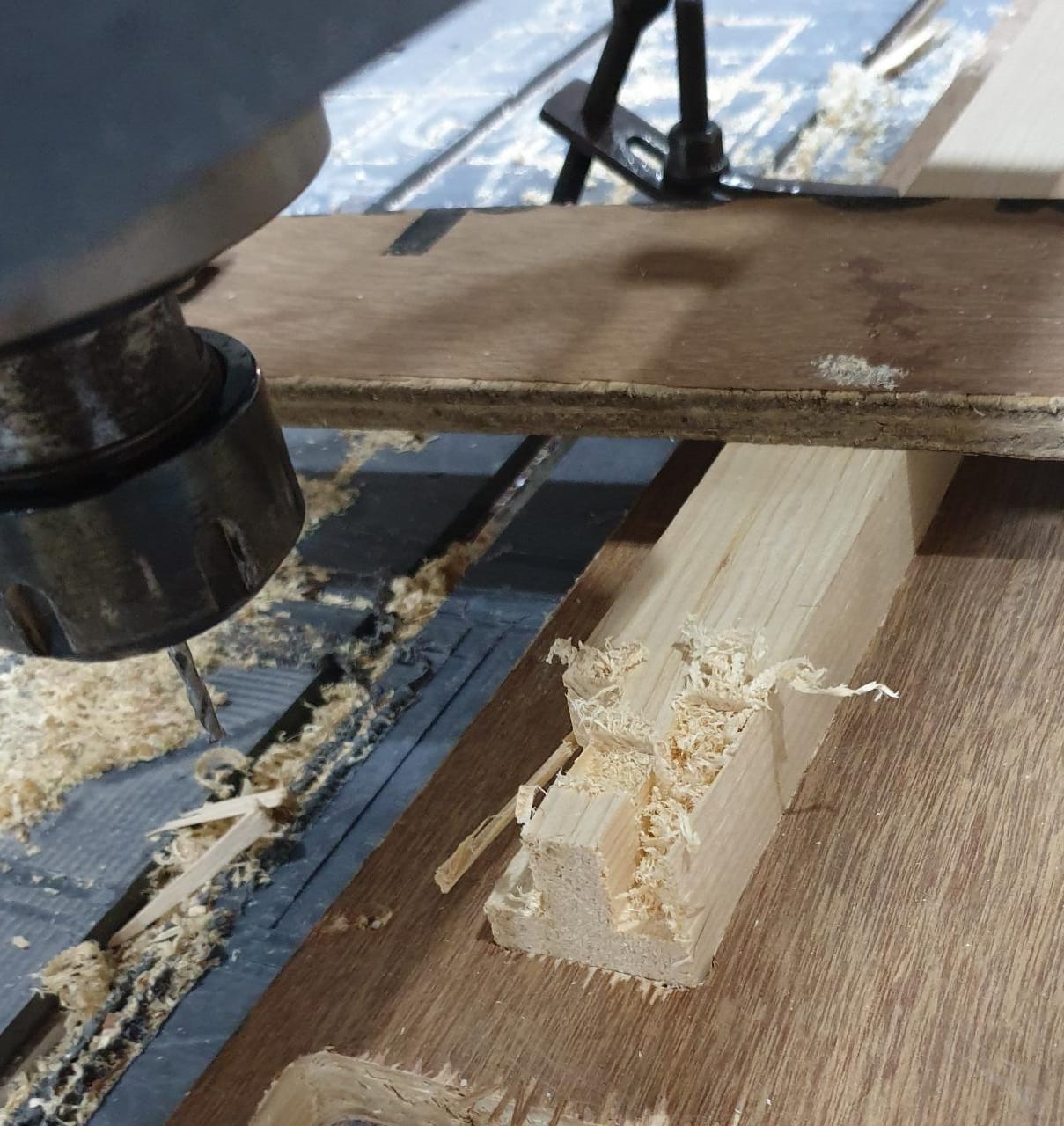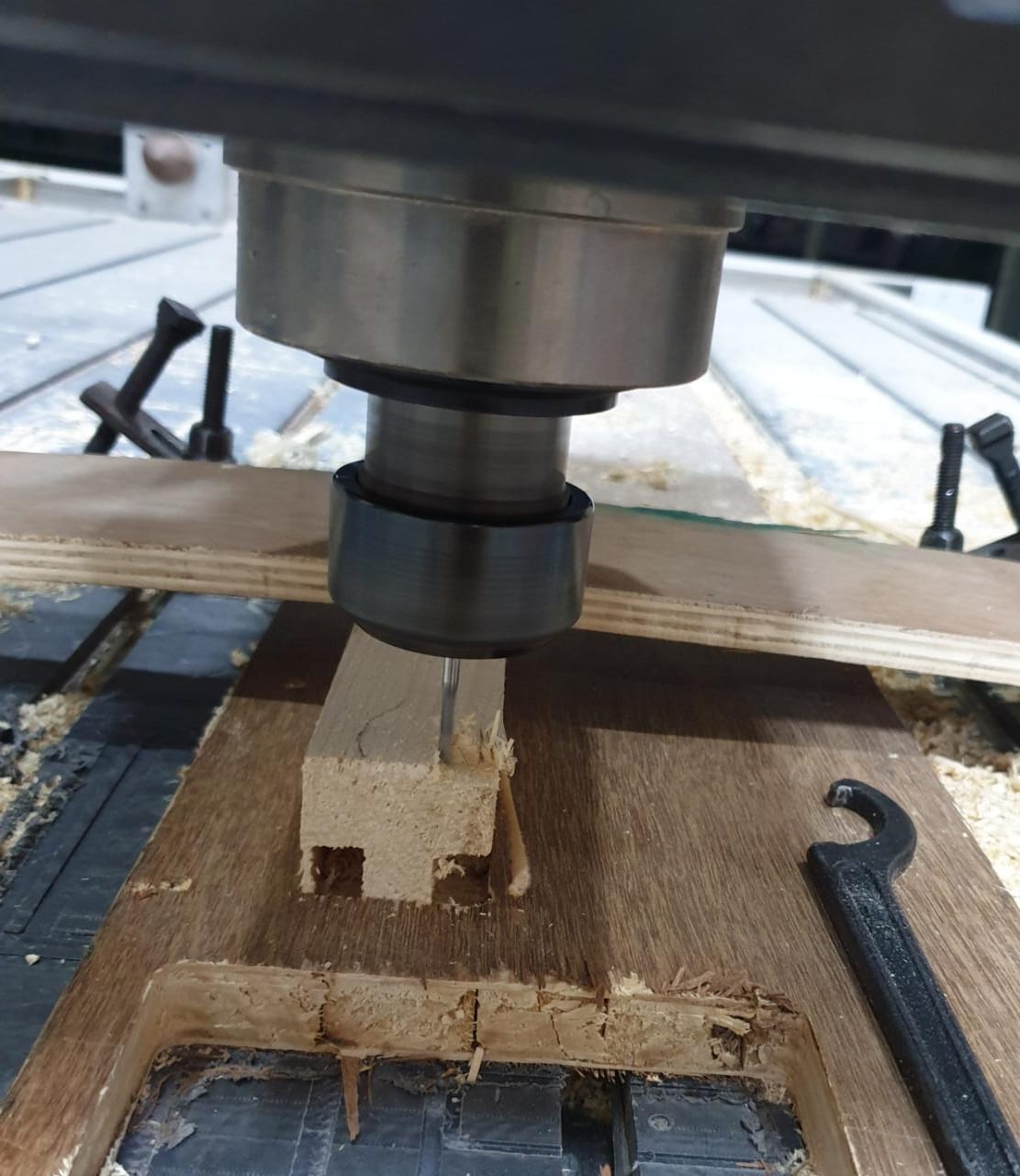 Cutting these joints on the CNC machine was a big challenge to me. We didn’t have the 40mm length endmill and I had no idea how to cut these on CNC. Then, I came up with an idea of cutting it in two parts, half way down from top and then flip the piece 180 degree and cut another half. But in that case, there was the challenge of keeping the origin same or the piece at the exact position where it was while cutting the first half. So, first, I cut a jig/pocket 10mm deep on the bigger piece of plywood of the exact dimensions of my block. Then I inserted the block in the jig and clamped it tightly. For cutting, I used 6mm endmill but the cutting was very rough as the pine wood is soft in nature.