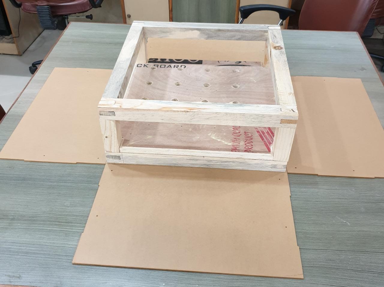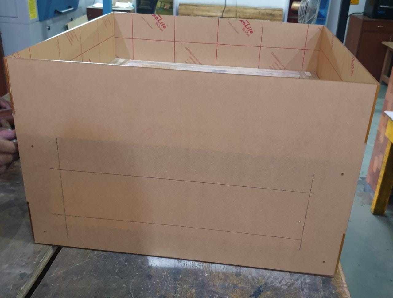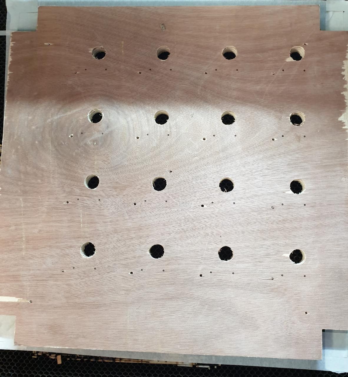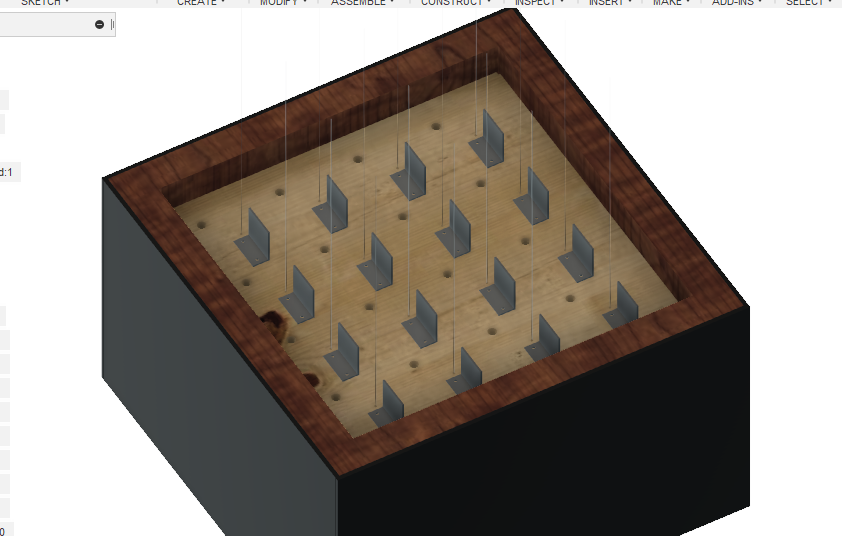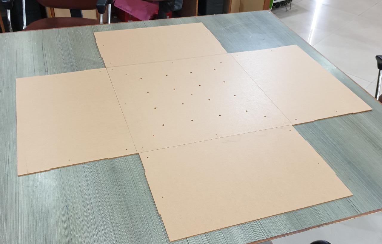 Side and bottom faces I cut in 3mm acrylic. The bottom has 16 holes of 6mm each from which the thread pass. The sizes of the 4 side faces are 482X300mm and the base is 482X482 mm. I designed finger joints in that so that they align perfectly.