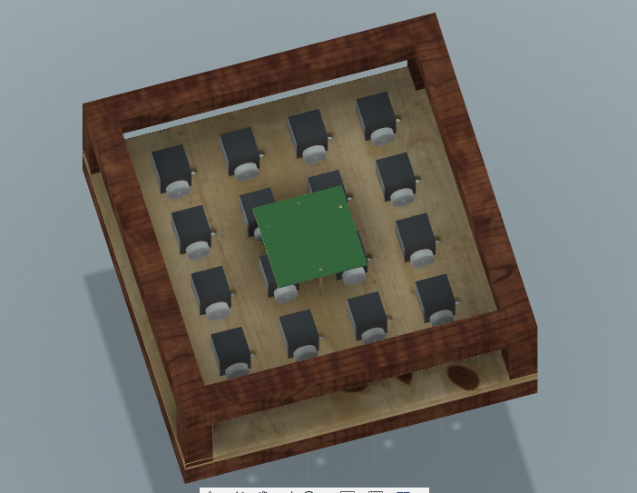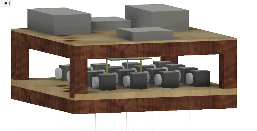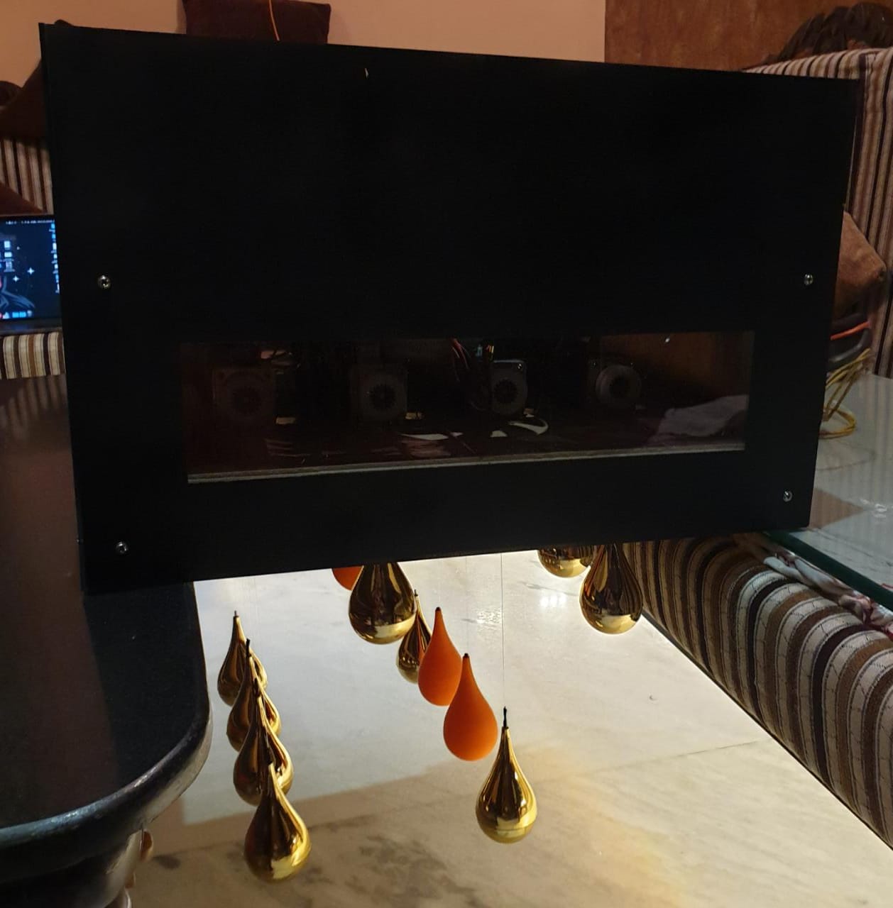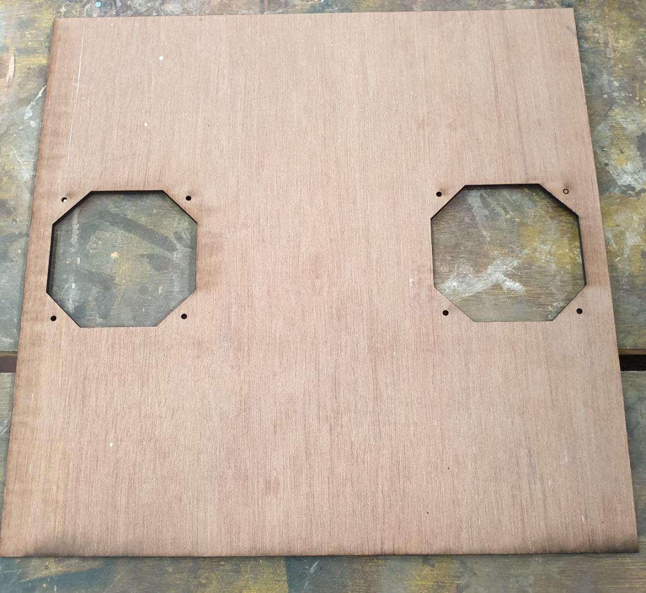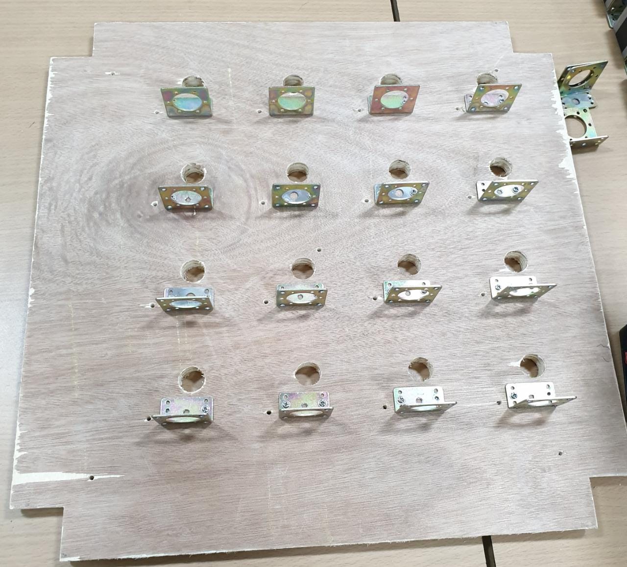 Side and bottom faces I cut in 3mm acrylic. The bottom has 16 holes of 6mm each from which the thread pass. The sizes of the 4 side faces are 482X300mm and the base is 482X482 mm. I designed finger joints in that so that they align perfectly.