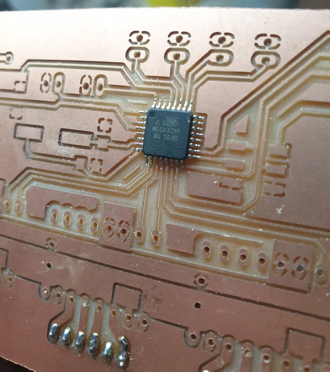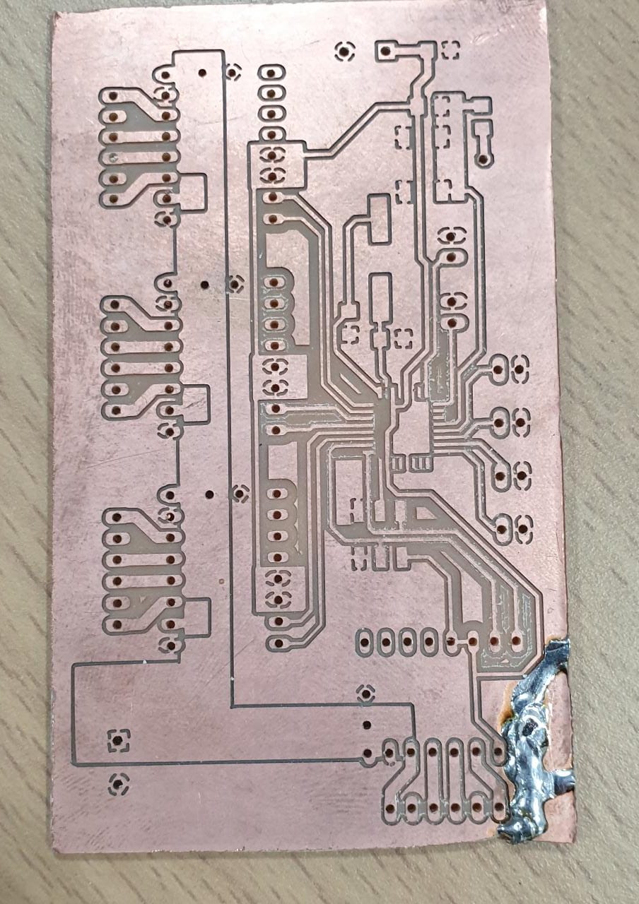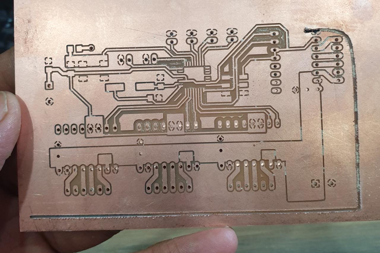 While milling one of my board lifted off of the platform. Fortunately this was while cutting the outline and it didn’t cut the traces. I removed the board from the machine to check and tried cutting manually using a blade and the moment I applied a little force, it broke from one corner. I just didn’t want to mill another board so I welded the two parts using soldering iron and solder ;)