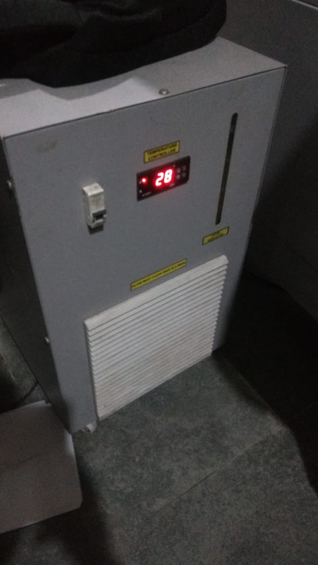 we have to witch on the chiller and look at the temperature in the desplay as it should not go abovae 25C Swithcing the Main power button ON of the laser machine( KEEP THE OTHER SWITCHES OFF FOR SAFETY PURPOSE) When the laser machine is ON we try to look at the settings in the display panel of the machine. The origins can be set from this panel now the lamp and exhaust should be ON to cut the files we can either connect it to the desktop or take a pen drive and copy the the files in it from the desktop. Insert the Pen drive in the machine panel for USB