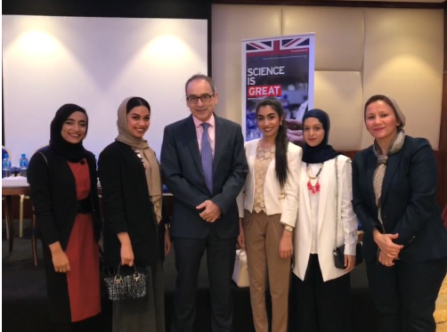 This is a picture taken in the women empowerment and engineering event held in The Diplomat Radisson Blue hotel, in which the outstanding female engineering students were chosen by the university in order to attend the event. The picture was taken with the British Ambassador, H.E. Simon Martin CMG.