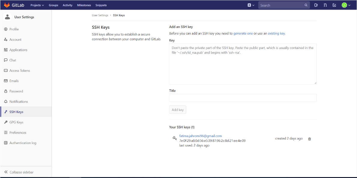 I started editing my website indirectly using Git Bash which uploads the changes I do in my website manually without using GitLab. To do this, a local repository should be connected to GitLab, in which a SSH key should be created first. The following steps will show a detailed demonstration of how it was done.