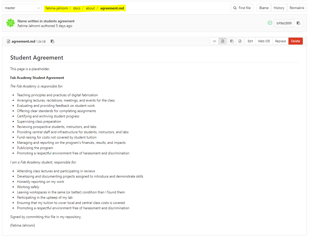 The student agreement was found in the FabAcademy website, in which it was copied and pasted in the GitLab.