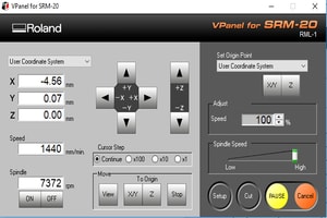 The VPanel was then used to adjust the settings before cutting. The X,Y,Z origins should be identified. This depends on the area you want the end mill to cut on the board. It can be easily adjusted by the clicking the arrows on the panel. For Z origin, use the cursor step option to move the end mill in your preferred step. Ensure that the end mill doesnot hit the surface hard since it will break. Once the origin is defined, click the X/Y and Z buttons placed under the Set Origin Point section. The speed should also be adjusted. Referring to the instructions page for milling the circuits, it was given to use at a speed of 3/4 for the tracks and 0.5 for the outline cut. Lastly, set the spindle speed as medium and click on cut.