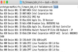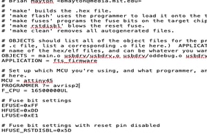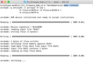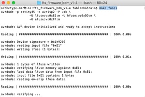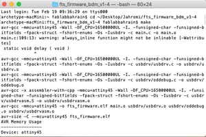 After installing the software, the first thing you have to do is create a new folder of your own in order to place all your downloaded files here. Download the firmware source code into your folder from his page as well, and unzip the file in your terminal by typing unzip fts_firmware_bdm_v1.zip and then make to build the file that will help you program the ATtiny45. This step will be shown in the first two lines of the command lines below.