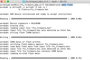make flashin your terminal. This will erase the target chip, and program its flash memory with the contents of the .hex file you built before. You should see several progress bars while avrdude erases, programs, and verifies the chip.