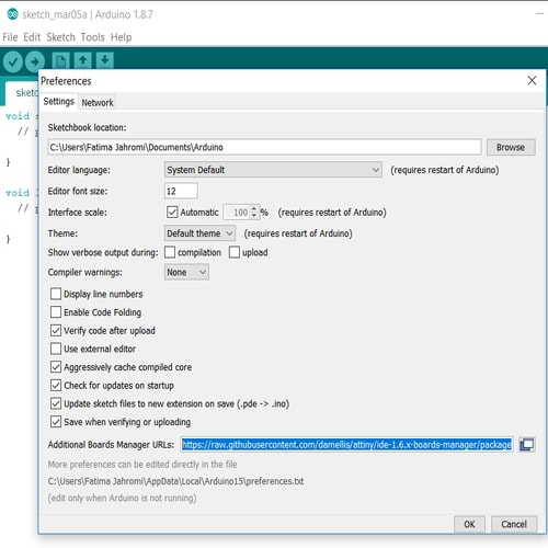 Install the ATtiny support using the built-in boards manager. I found the link to install in the above mentioned tutorial. You can also just type in google ‘attiny44 programmer arduino’ and you will find many links. Then, go to File > Preferences, paste the link in the ‘Additional Boards Manager URLS’ as shown below and click ok to save.
