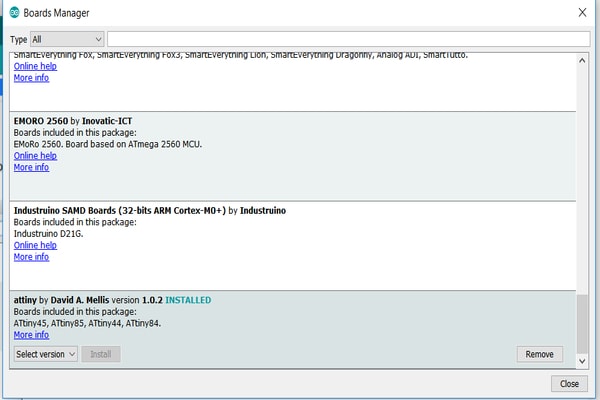 Go to Tools > Board > Board manager. You must find the ATtiny at the bottom of the list. CLick install and after its done you should see the word ‘installed’.