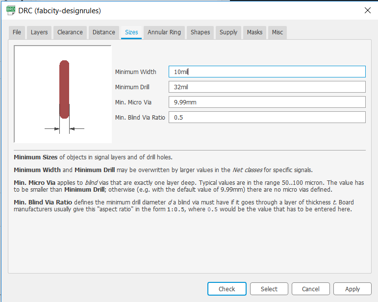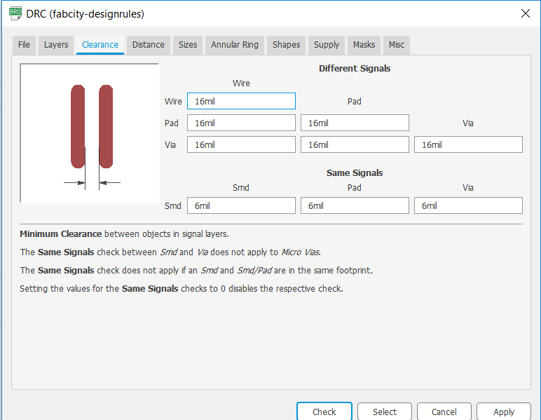 Before starting to draw the connections or traces between the components. Check your design rules. You can find this icon at the bottom of the toolbar as ‘DRC’. Ask your instructor for the design rules. This will include the width of the traces, clearance, distance between each trace etc. Start drawing the traces by selecting the ‘route’ icon in the toolbar. Draw the route by dragging from one end of the component to the other end of another component.