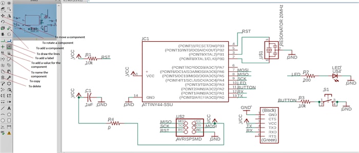 This is the schematic of my circuit that I have designed. As per the requirements, I have added the LED and button in which you will find them at the right of the schematic. I have also shown some of the basic tools that I have used to design the schematic. I did face quite issues while designing the PCB later since I wasnt able to connect one trace due to the overlapping problem. I did change my circuit design twice, changed the positions and orientations of the components but it did not work. I was always left with one overlapping trace, therefore, I placed a 0 ohm resistor which connects the VCC of the capacitor to the VCC of the AVRISP. This can be seen as R4 at the bottom left of the schematic.