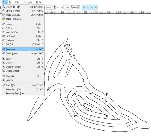 Click on the outline and go to Path>Linked Offset. A node will appear at the top of the sketch. Grab the node downwards or upwards to create offsets from the shape.