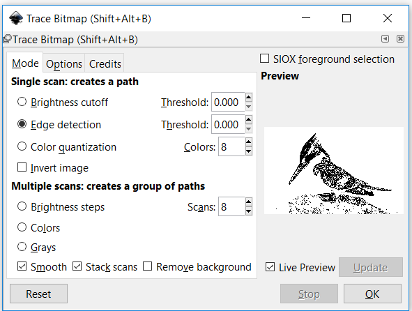 I played around in the ‘Single scan: creates a path’ settings until i got the best trace out of the image. You can look at the preview whenever you change the settings by clicking on ‘update’ at the bottom of the window. Once you’re happy with the tracing, click OK.