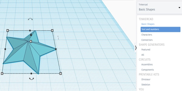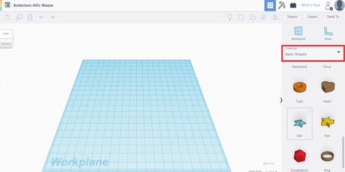 On the right, there will be a design toolbar where you can choose the items that you want to create. In addition, there will also be a ‘Tinkercad’ drop down list where you can choose your categories and start design your model. I started off by choosing a star and dragging it onto my workplane.