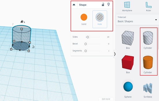 I then wanted to create a hole at the top so that I can hang it somewhere or have it as a key chain, therefore, I chose a cylinder to create it. I can either choose a ready hollow cylinder from the basic shapes, or choose a solid cylinder and then change its properties to hole whenever I want to.
