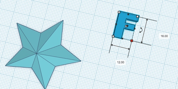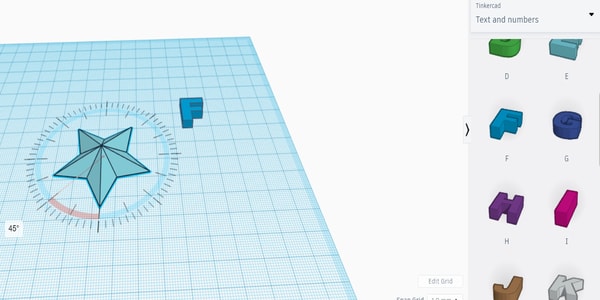 To explore more in tinkercad, I went to the drop down list and discover the things that are available there. I selected the text and numbers and chose my letter “F” to place it on the star. I also tried rotating the model to see how it works. I just dragged the pointer in the circular labelling shown and the object rotated.