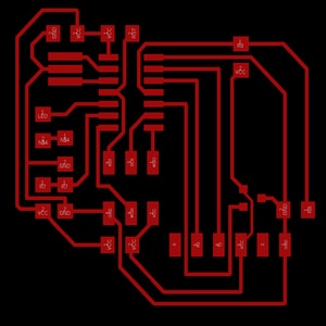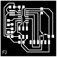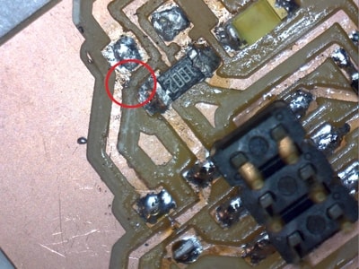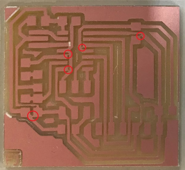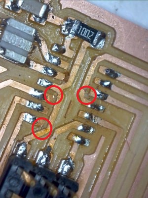 Aftering soldering the components, I tested the circuit by doing the continuity test using a multimeter and found connection between the gnd and the vcc, as well as some connections between the attiny pins. I referred back to the above milled circuit image to find out if the circuit was milled properly, and I found 5 connections that the bit did not remove. This is shown in the image below.