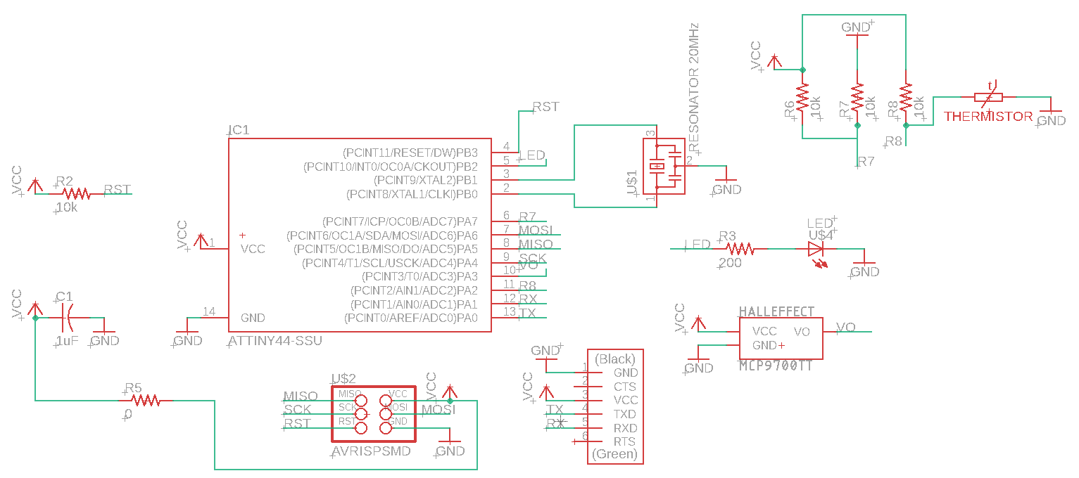 To start of with the schematic, I edited my echo hello world according to what I require for my circuit. Instead of the button, I added the thermistor and the hall effect sensors. In addition, I referred to the attiny44 datasheet to help me identify which pins have ADC for connecting the thermistor to since I had limited amout of pins left on the my attiny44. I had to research and read the datasheets of my sensors to find out if my sensors both give out analog signals or not. I then came back to the attiny44 datasheet and connected the thermistor pins to ADC pins specifally since the hall effect sensor gives our digital signals.