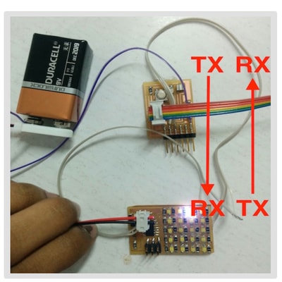I then researched for serial communication between two attiny boards and I came across this page which helped me to do it. I again followed the instructions written on that page for connecting the wires and below is an image that helped me alot while connecting.