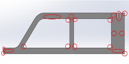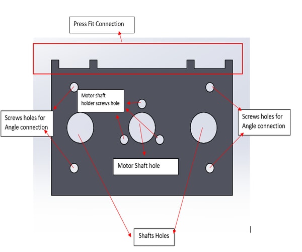 - The holes here were to assemble the main structure of the machine using 4mm bolts and nuts together with the brackets for cornered edges. This was done to increase the stability of the model.