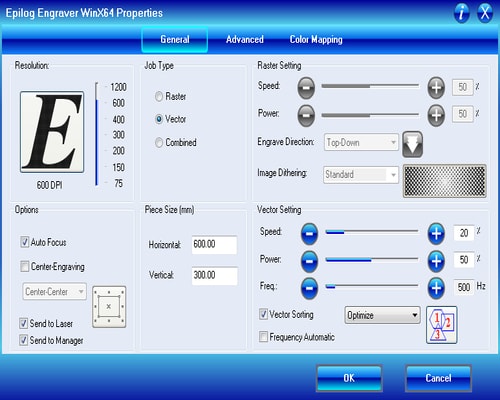 Click on File > Print and adjust the properties before printing the file. Below are the settings used. The speed, power and frequency was set by referring to the epilog catalogue software which comes along with the laser cutter machine. After setting everything, click print.