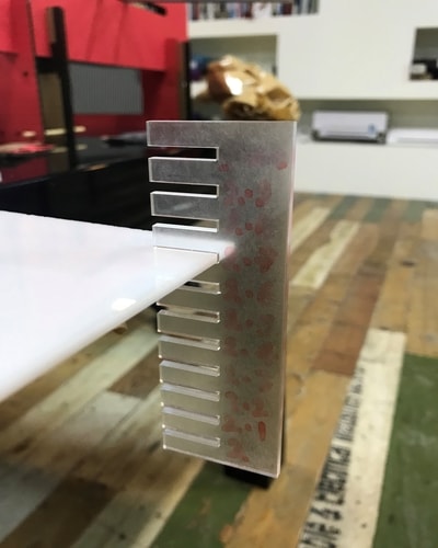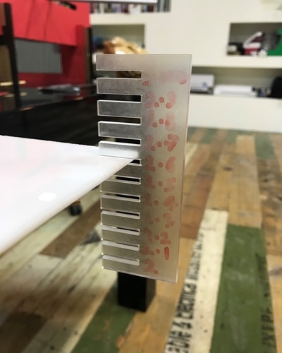 Before fabricating, I ran a kerfing test for the acrylic sheet that we used for our machine by using the acrylic comb that was made earlier for our group project. This will help us to have better fittings for the final product. The image below shows that 2.7 mm had the best fit. The 2.6 mm went almost halfway through but got tighter at the end, and 2.8 mm was loose for the sheet.