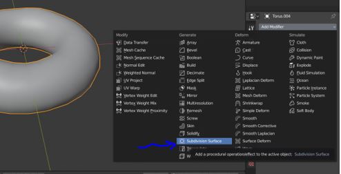 7- However, the edges still looks sharp. Therefore, enter to the spanner > add modifier > and chose the following modification tool “subdivision surface” which is very common to used in 3D software.
