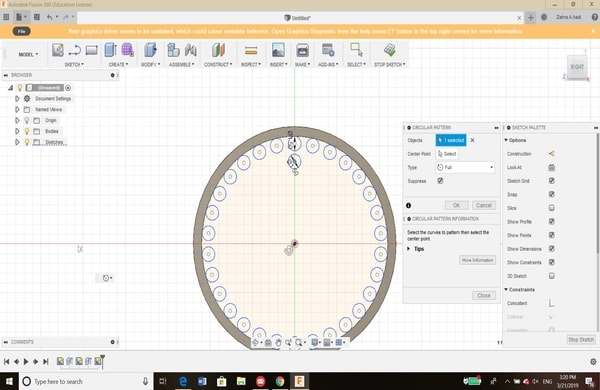 2- Then, on the left side of the object I have sketched a capillary tubes inside the main tube with a diameter of 1.5 mm. For each circle I was creating a pattern, so I did not sketch all of them one by one.